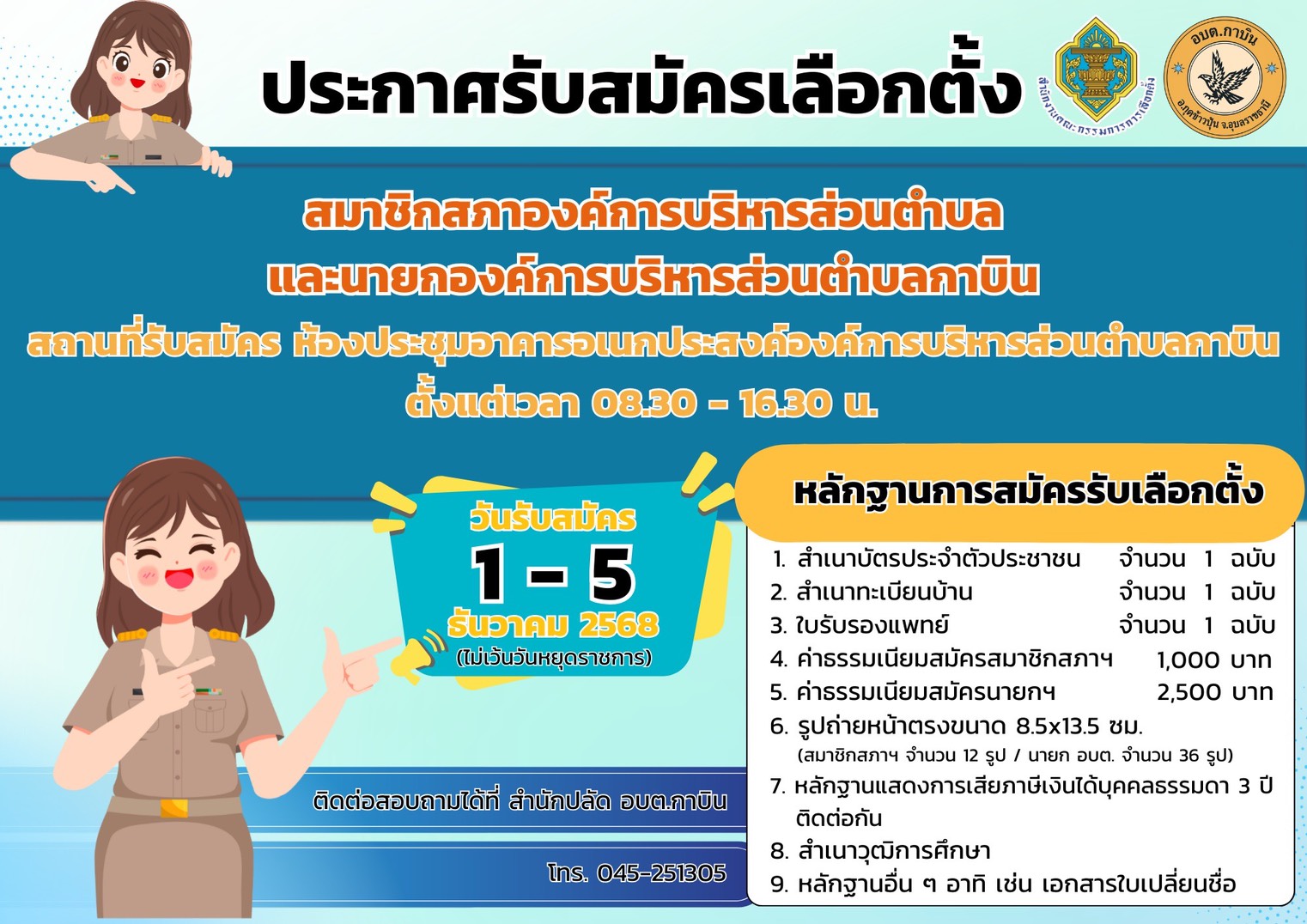 ประกาศรับสมัครเลือกตั้งนายกองค์การบริหารส่วนตำบลกาบินและสมาชิกสภาองค์การบริหารส่วนตำบลกาบิน